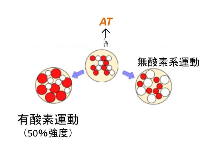 AT付近の運動は、有酸素運動能max付近で、白筋が作動し始める付近で重なりがあり、どっち付かずと推測される。